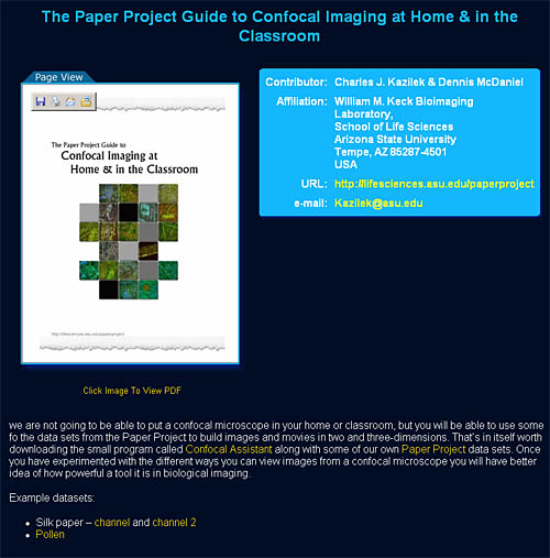 The education section of the CD featured the Paper Project Guide to Confocal Imaging at Home and in the Classroom. A fun way to get the feel of confocal microscopy in your home and or classroom. Microscope optional.