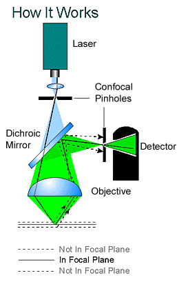 areas are prevented from being imaged by the final confocal pinhole opening (dashed